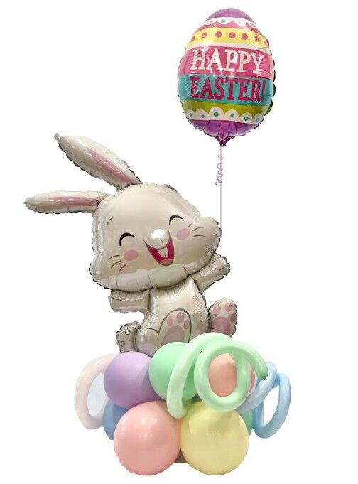 - Air-filled happy hoppy bunny balloon on a double layer, 5-cluster, mixed pastel balloon base with balloon curls, holding a helium filled Easter Egg foil balloon.