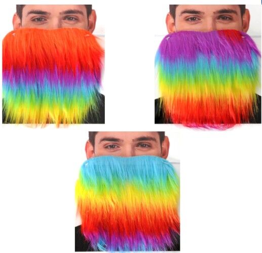 • One Rainbow Party Beard - affixes with white elastic behind head - so better grab a rainbow hat to complete the ruse.  Assorted designs - price is for a single beard only.